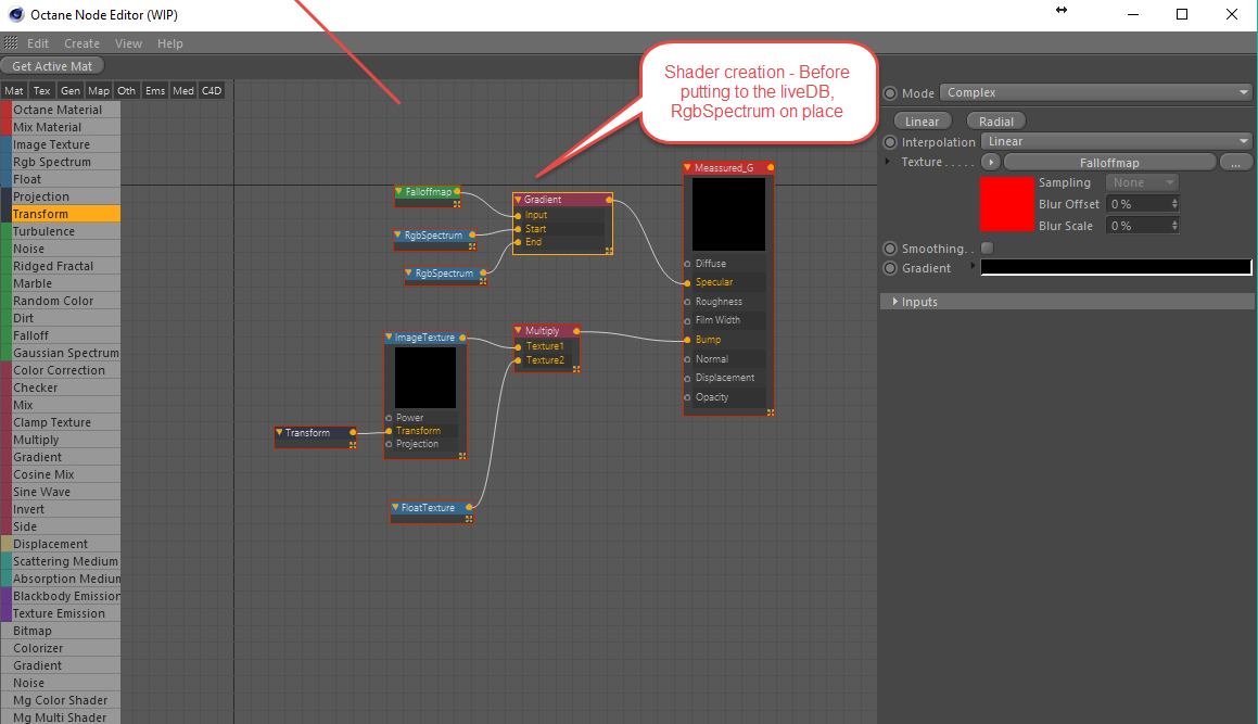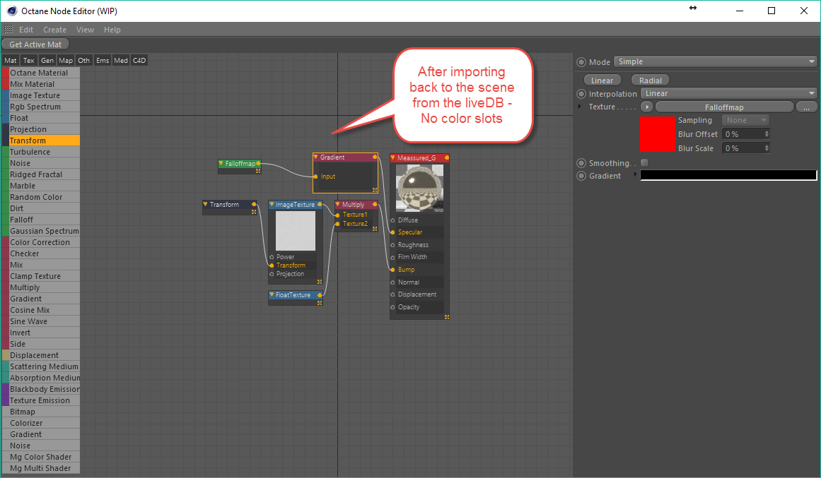 While loading it back from the liveDB the RgbSpectrum nodes are gone. the material still looks the same but it is not possible to change the colors.