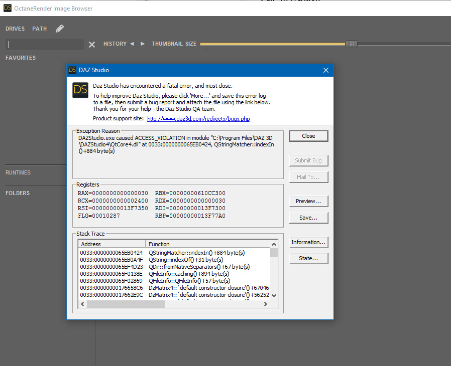 Hi when go to the environment tab and use the image browser to change HDRI image I get an error and DAZ studio crashes to desktop.