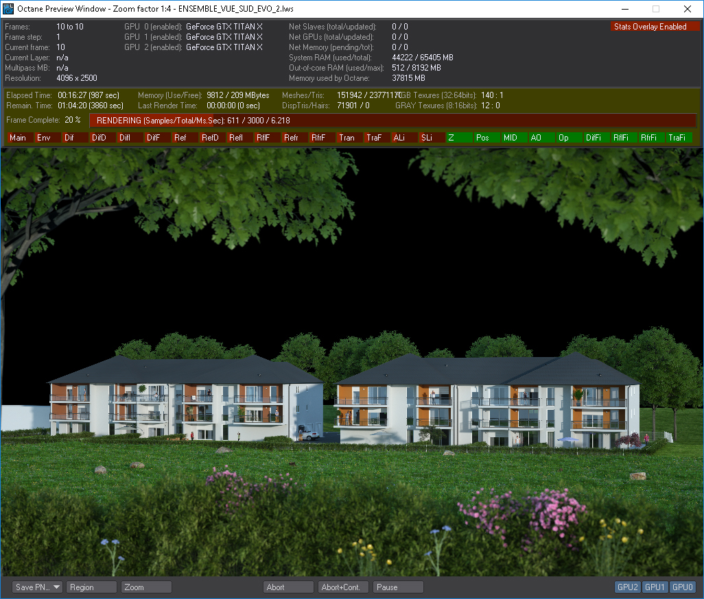 Beyond the rendering time - 1H24 4K 3000 PT - what attracted us is the fluidity of the work with the open IPR, stability and rendering quality.