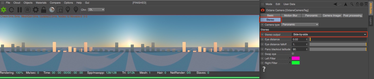 2) Using C4D "stereoscopic" render setting - This actually does render both a stream left and stream right, however octane doesn't know its rendering two different images and overwrites the left eye once it does the right eye.