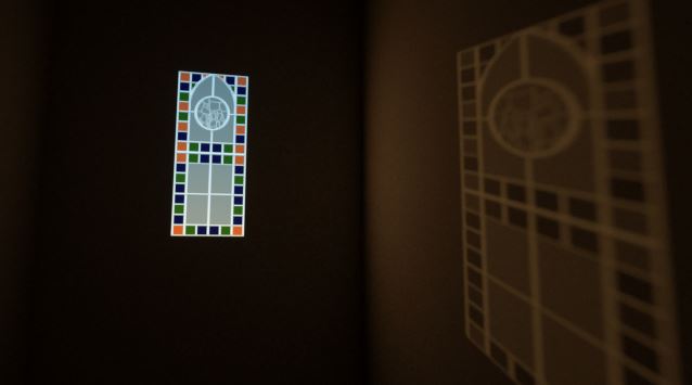 The stained glass effect can be done through the "fake shadows" checkbox in the window's texture image. This fake shadow effect can be influenced by the environment and lights in the scene.