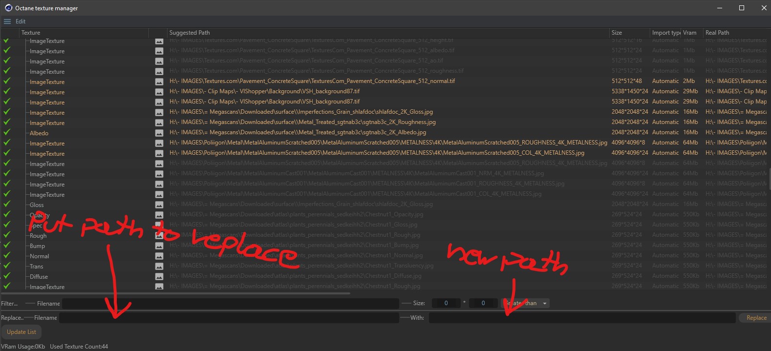 Hey there, thanks for taking the time to explain, but that is exactly what I mean by doing it manually and what I want to work around as this is what I am doing atm. its a lot of textures with all kinds of different paths and doing this manually - and I mean manually inputting paths etc. - would take forever. Also the suggested path in octane texture manager is just showing the filename. In the Project Asset Inspector the filenames are the only thing present and they are filenames only, so relinking is not working, dont ask me why. Even if I point it to the exact folder by hand.