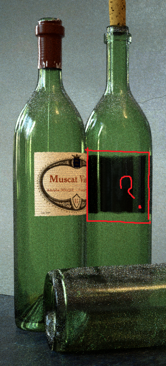 If this is with path tracing, it is probably due to the distance between the bottle and the sticker being too small for the ray epsilon to properly reflect indirect light onto it...