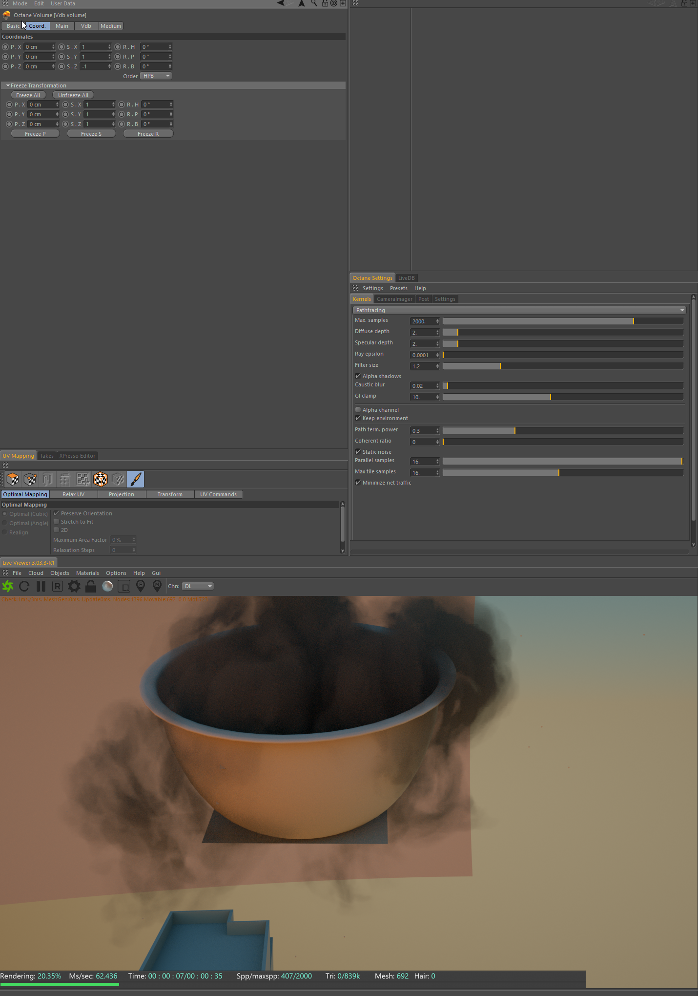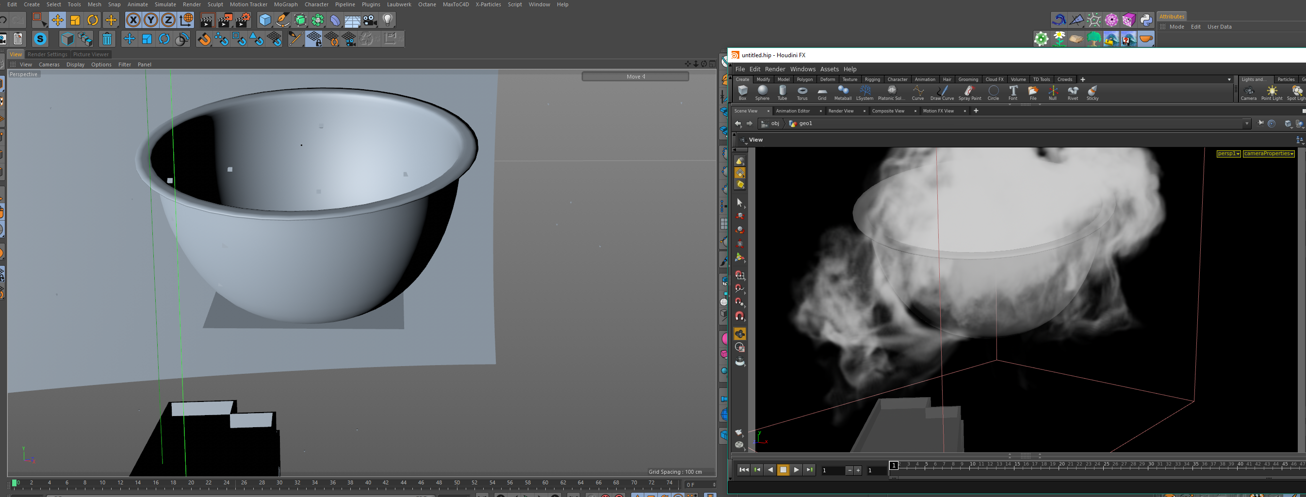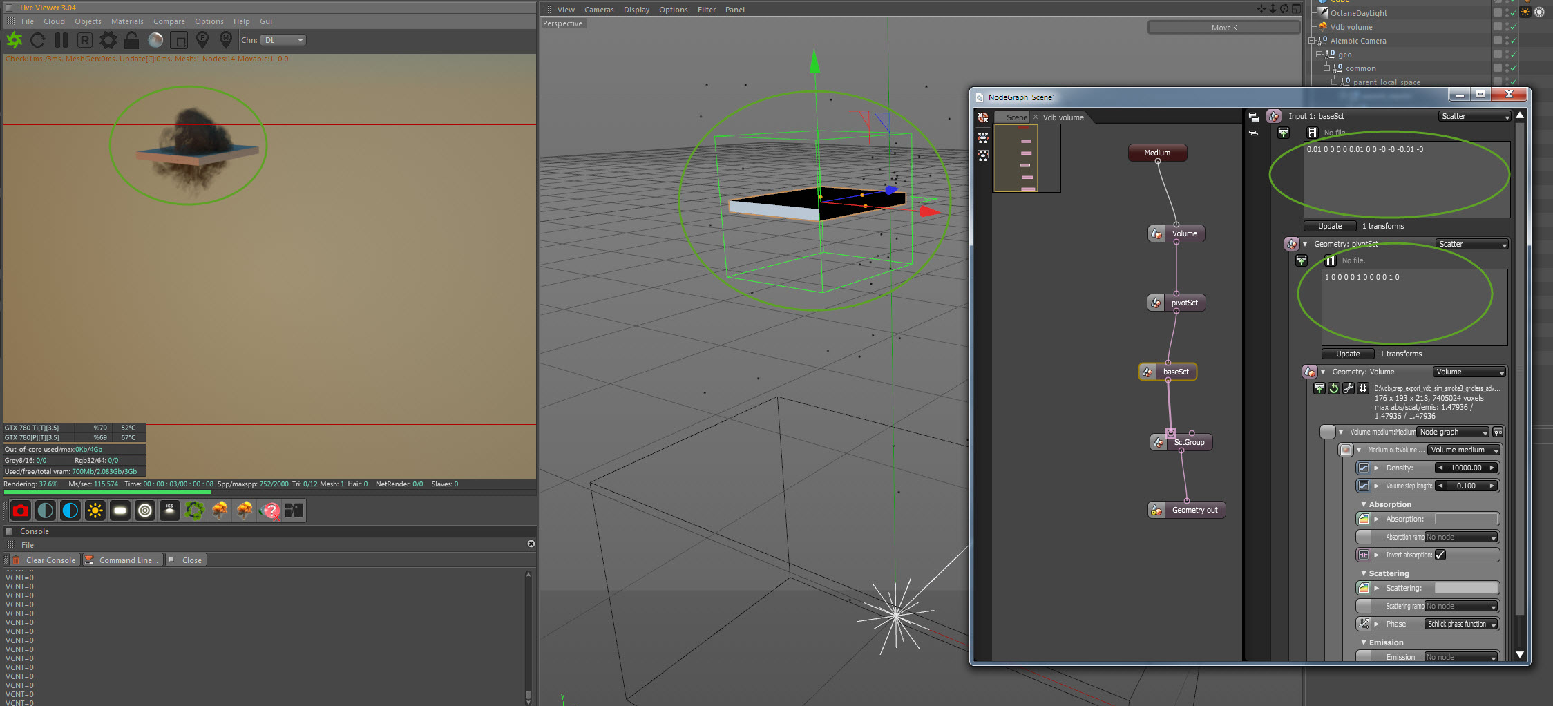 When loading the VDB sequence to Octane VDB volume, it does not seem to be in the right world space, it got some weird offset from the original position (inside the bowl). If I'm trying to load everything inside Houdini it all fits and in the right place.