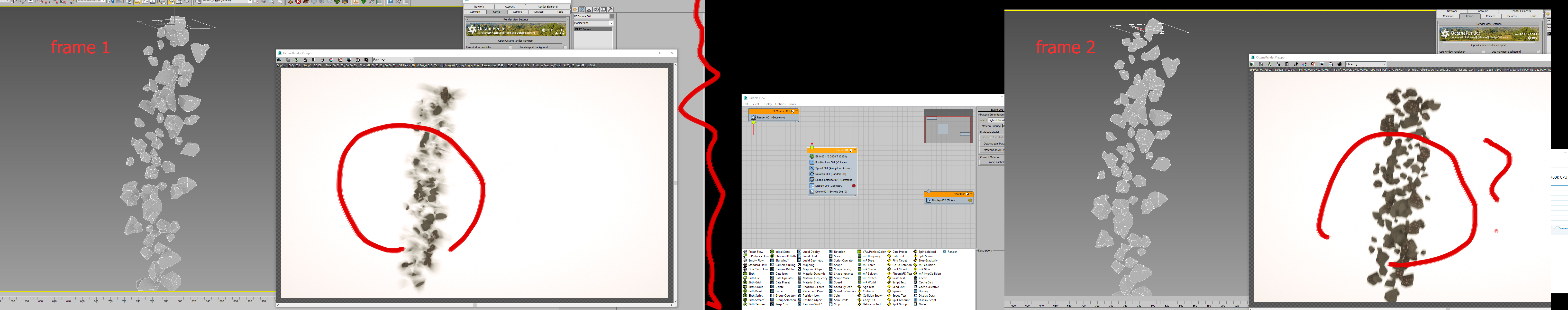 Also I guess it works in frame 1 - rocks are falling down but motion blur looks strange. looks like 3ds max particles and octane motion blur never worked right even before