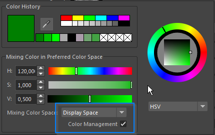 in the color picker you can set color as you like, using display space or rendering space or without color management. What am I missing ?