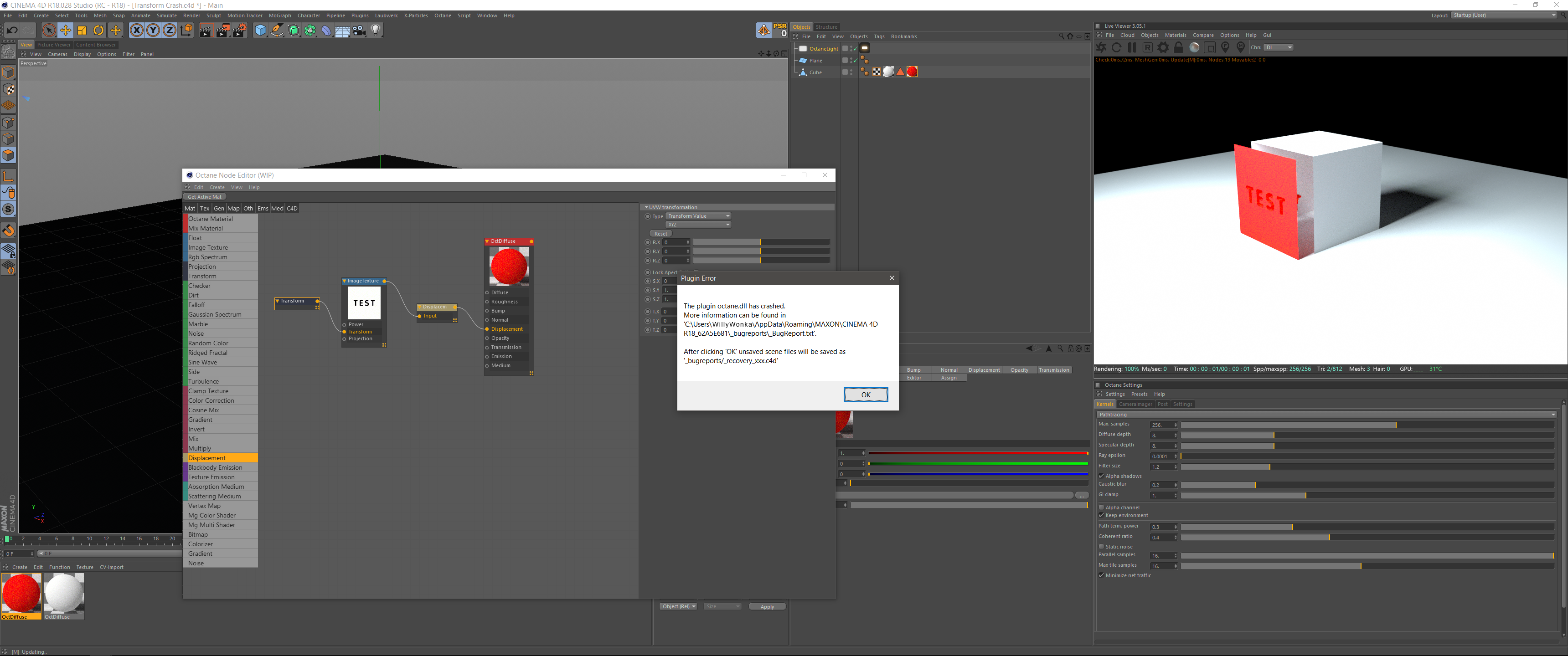 Thanks for very good information. That's what i need as always. Here as you can see it's not about transform node. It's about being under displacement. It crashes in standalone too. I'll report it to Octane developers. thnx