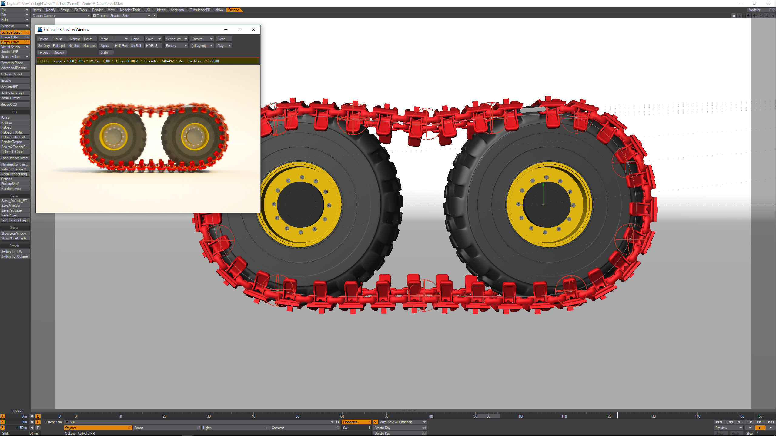 Wherever the animation starts, that's where the wheel remains - which is why I assumed it's something I've not set correctly. If I scrub through with the IPR open, all looks fine, but the F10 render leaves the wheel behind from wherever in the animation the render range is set to start. I had started the renders off at frame 0, with the whole track off-screen, which is why the only thing I saw was the tarck moving in attached to only the first wheel - the real geometry wheel.