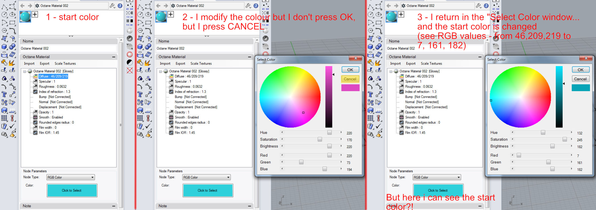 2 - I modify the color of an rgb texture (on "Select Color" window) but I don't confirm the change pressing "OK"....instead I press "Cancel". If I come back in the "Select Color" window, the color is changed.