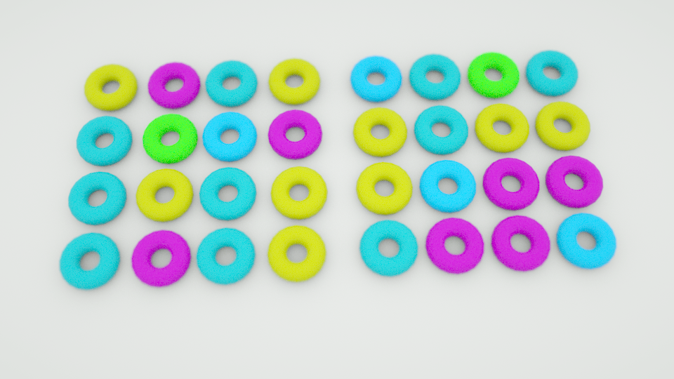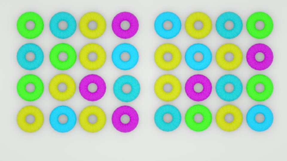 in this scene you can compare on simple objects :<br /> on the left, your Virtual Material setup with mutliple nodes,<br />on the right the same done in few seconds with only 3 nodes !!! (random color node workflow)