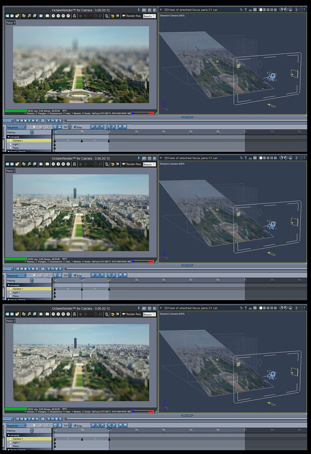 I'm trying to simulate a tilt shift effect on basis of a distorted photo and animated camera focal depth by keyframes.