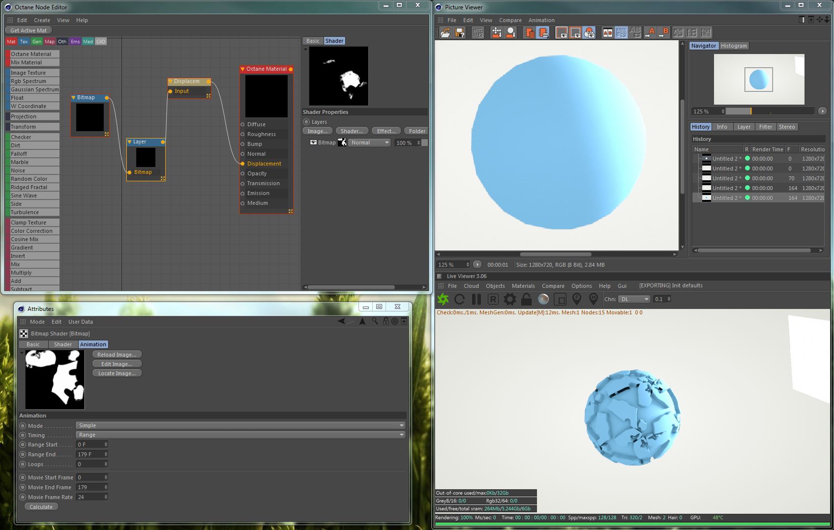Things are much harder to get worked than estimations. All of those, C4D shader's evaluations are big pain in codes. I couldn't get this worked better. Also going to this way is like using a ferrari on first gear. Correct way to use octane shaders, i know displacement is very limited. I think guys will bring a rasterizer node and it will solve a lot problems here. So we can rasterize any octane texture and use in displacement. Also with 3.1 we will have OSL version then we will have possibilities to re-write any shader in Octane side.Rev wrote: aoktar, the imageTexture does work, but it does not progress the image sequence like the bitmap shader does when inside of the layer shader. So if my sequence is image_000.jpg to image_120.jpg, I only get the displacement from the frame that I loaded, and not the rest. I can set the animation range from frame 0 to 120, and it only displaces according to the image I loaded in (frame image_050.jpg for example). The Bitmap shader on the other hand does progress the image sequence correctly every time, but then does not displace in picture viewer at all, It's like they both only do half the job hehe.