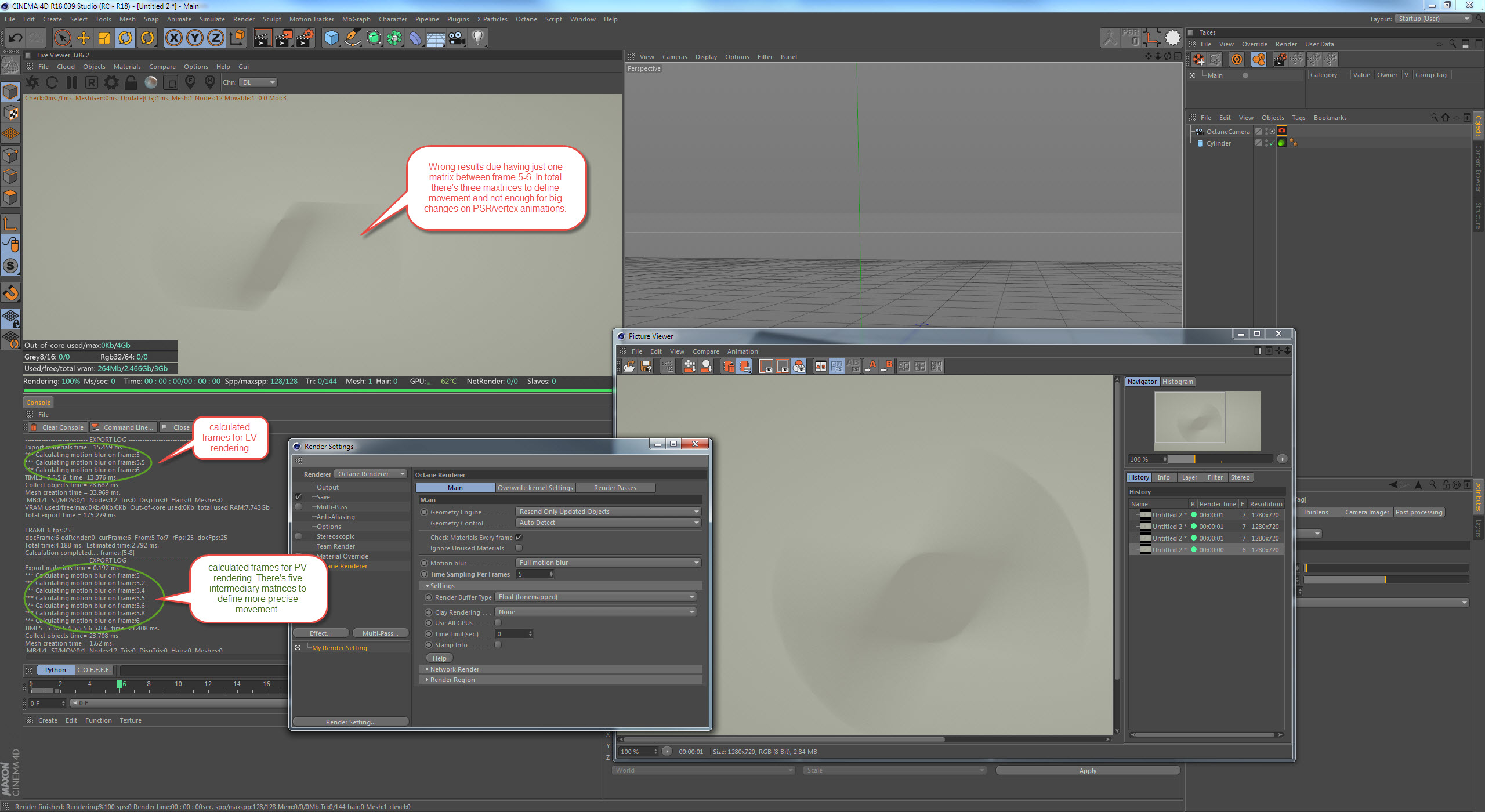 I've prepared a picture with notes to explain what's happening in depth. Additional information: When you scrub in timeline you need to go over a few frames to allow the plugin for storing enough frames. It's working with a caching system. For example, when you jump to frame 10, it will need to know PSR/vertex positions for extra frames(8,9/etc.. depends to shutter time and direction of mblur). So you can force to save it by going a few frames back.I've also noticed, as you've said, that if I restart the render in the LV, I'll get a preview of the correct motion blur, but if I move to another frame, the character or child object will then smear back out. Is there a control for time steps that I'm not aware of? Thanks