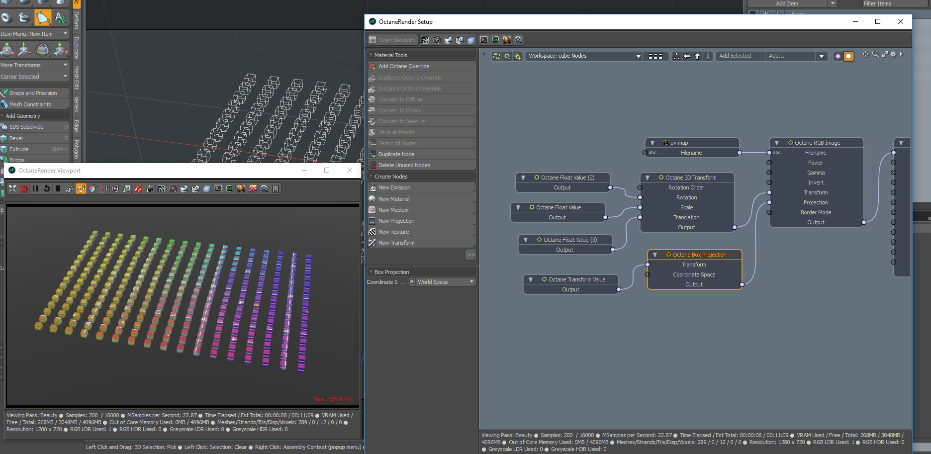 Modo Replicators translate directly to an Octane Scatter node - so in the situation you have described, there is a single cube which is the source of an Octane Scatter node with 100 transforms (being the cubes in the grid pattern). Octane provides no direct way to change the material of specific instances so all 100 cubes will have the same material. So the only way to change the diffuse color of specific cube instances is to use a texturemap with the UV Projection changed to Box and the project changes to have the projected image cover the extent of the cubes. This is the approach I suggested earlier in this thread.