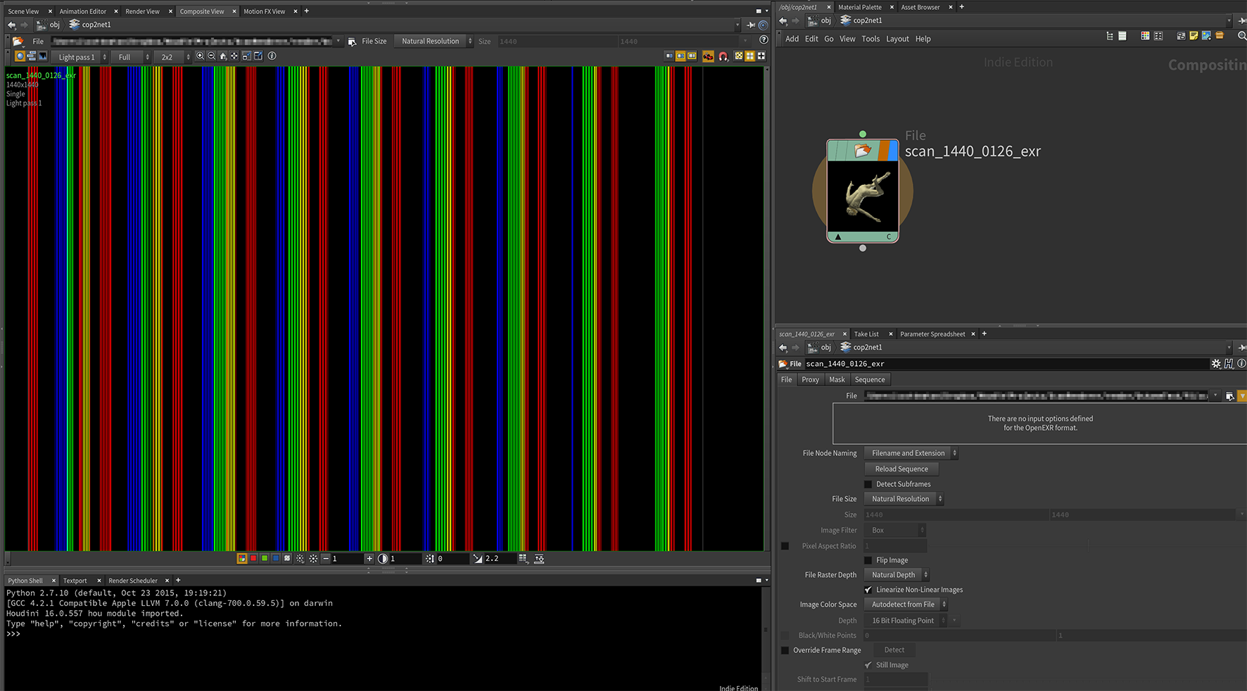 But when they are saved to disk as multicannel EXR and loaded in, they are broken - just a couple randomly colored vertical stripes going through the channel. I am reading the EXRs back in via COPs and this is what on of the light passes looks like (attached):