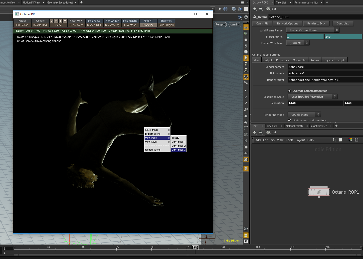 I have three light passes enabled, and Output Image Files check in the Octane ROP. I tried setting the file format to "EXR untonemapped" and also "PNG tonemapped" (instead of multilayer EXR) and strangely, it renders one image per frame but that image is the 3rd lightpass, not the beauty.