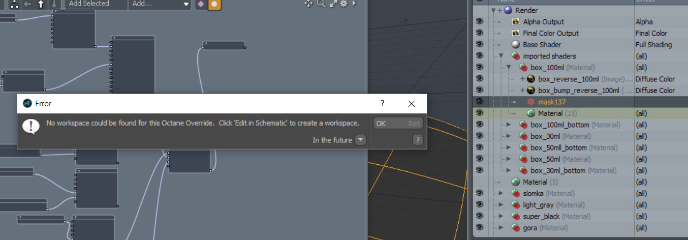 Then clicking on 'Edit in Schematic' in the Octane Override gives a 'Failed' pop-up. Also when having pressed 'Edit in Schematic' it