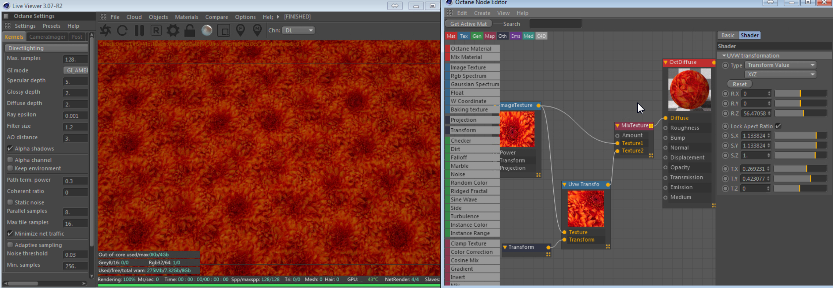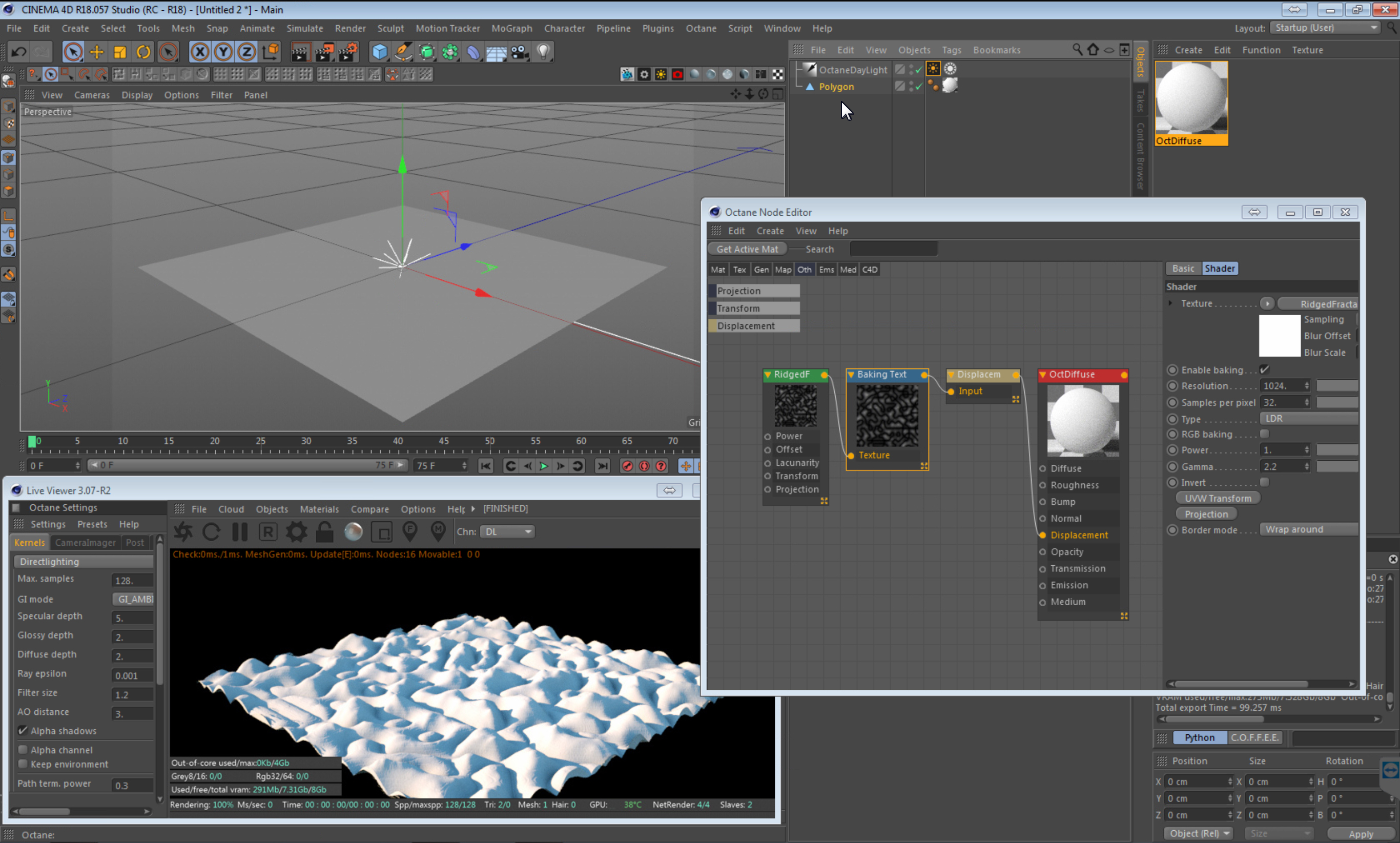 The easiest way to try the baking texture is with an Octane noise or shader and then in displacement: In practice, any group of node plugged into a Baking texture node are baked into a 2D texture node: