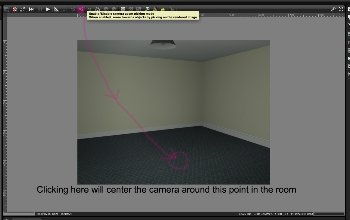See the attached screen grab of an empty room as an example.On first import my camera in this scene ended up outside the room.Firstly i used the tool to centre the camera on the outside walls of the room.Then i used the mouse scroll wheel to zoom in through the walls of the room.Then i used the tool to pick out a point in the centre of the floor of the room around which the viewpoint could swivel.