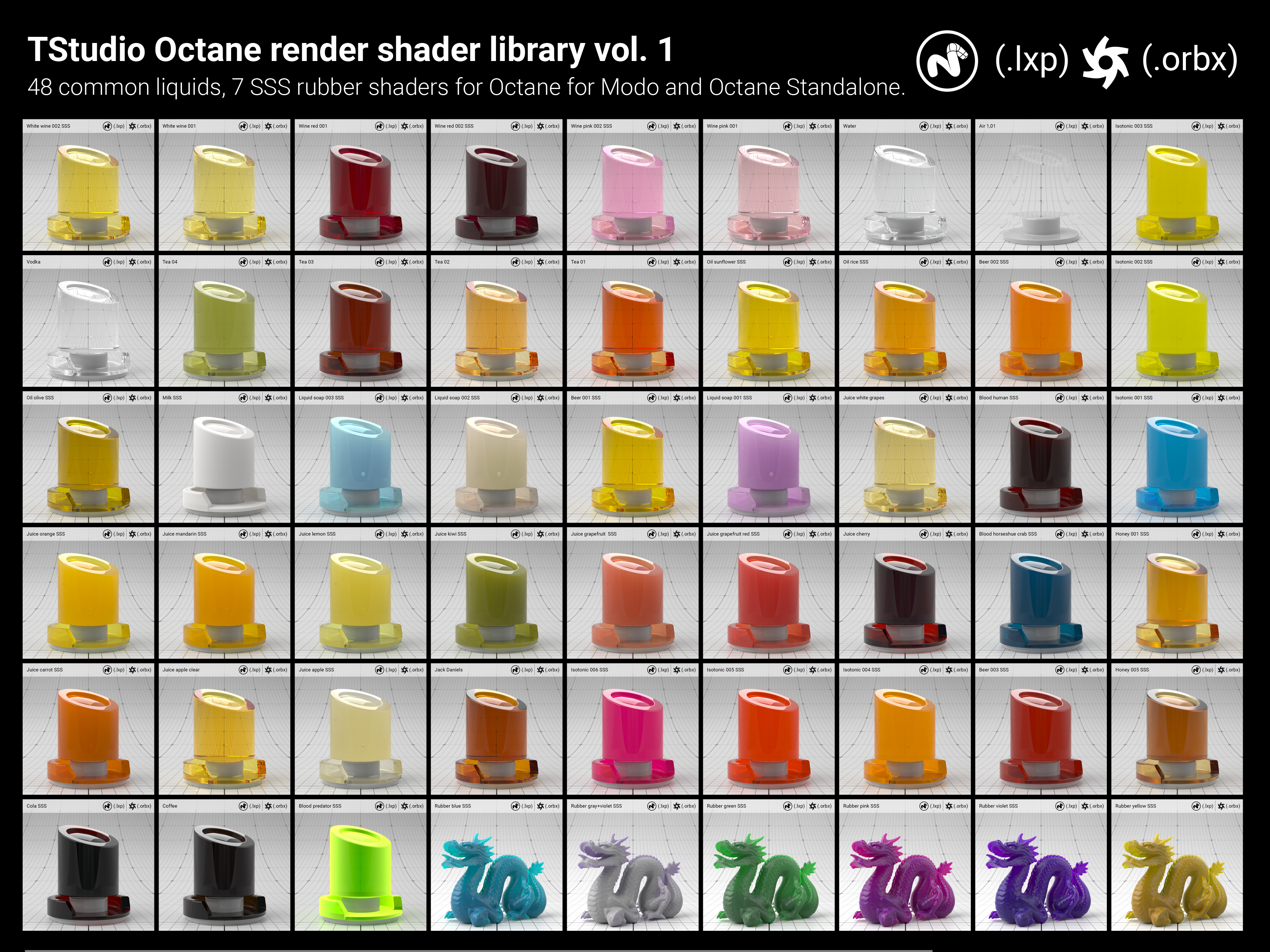 55 high quality advanced shaders for Octane render for Modo presets (.lxp) and Octane Render standalone (.orbx).