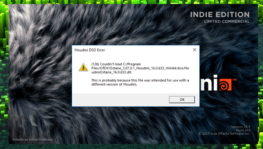 I have bought Houdini indie :-) version 16.5.323 and I have installed Octane for Houdnini "Octane_3.07.0.1_Houdini_16.0.633_Win64" but I get this error...