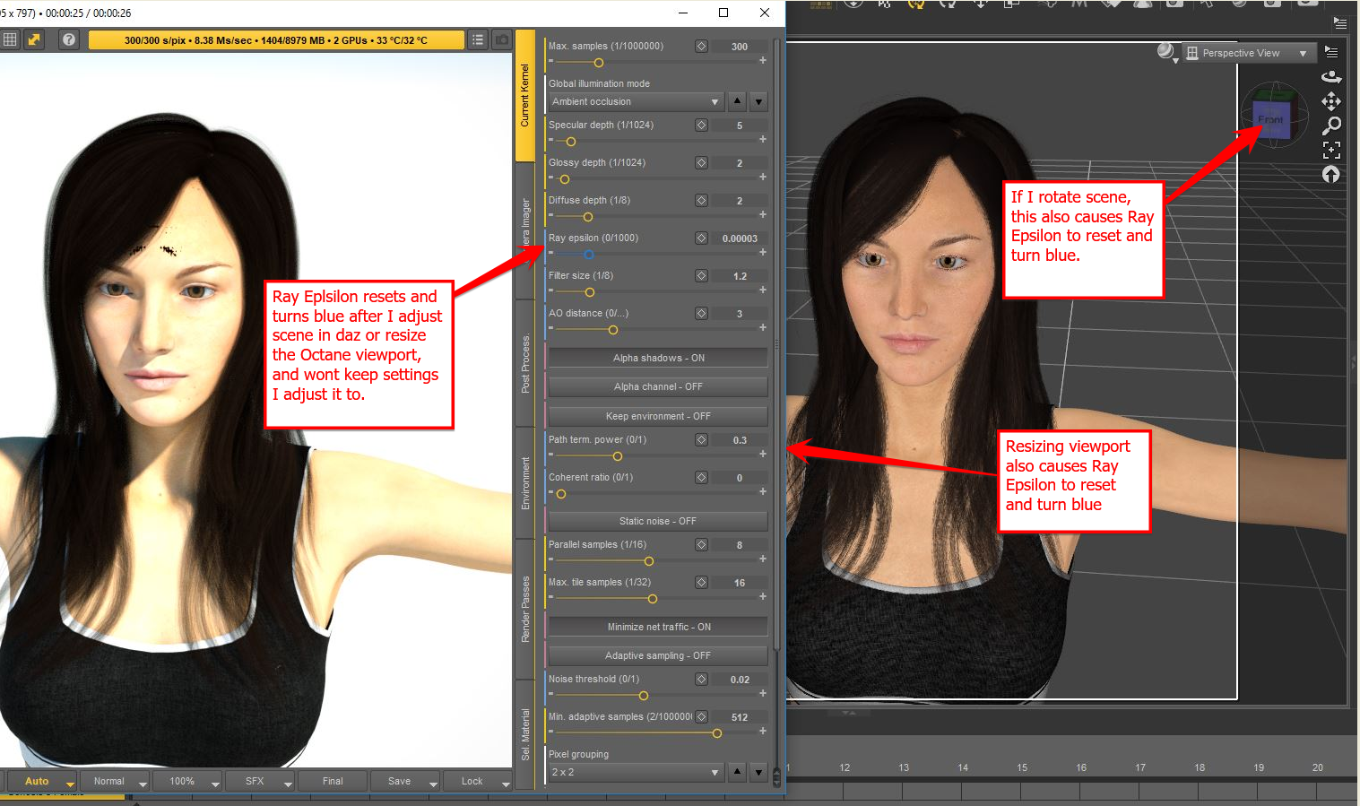 After changing the Ray epsilon value in Daz for Octane, the setting keeps resetting itself if I adjust the scene in Daz or resize the Octane Viewport window.