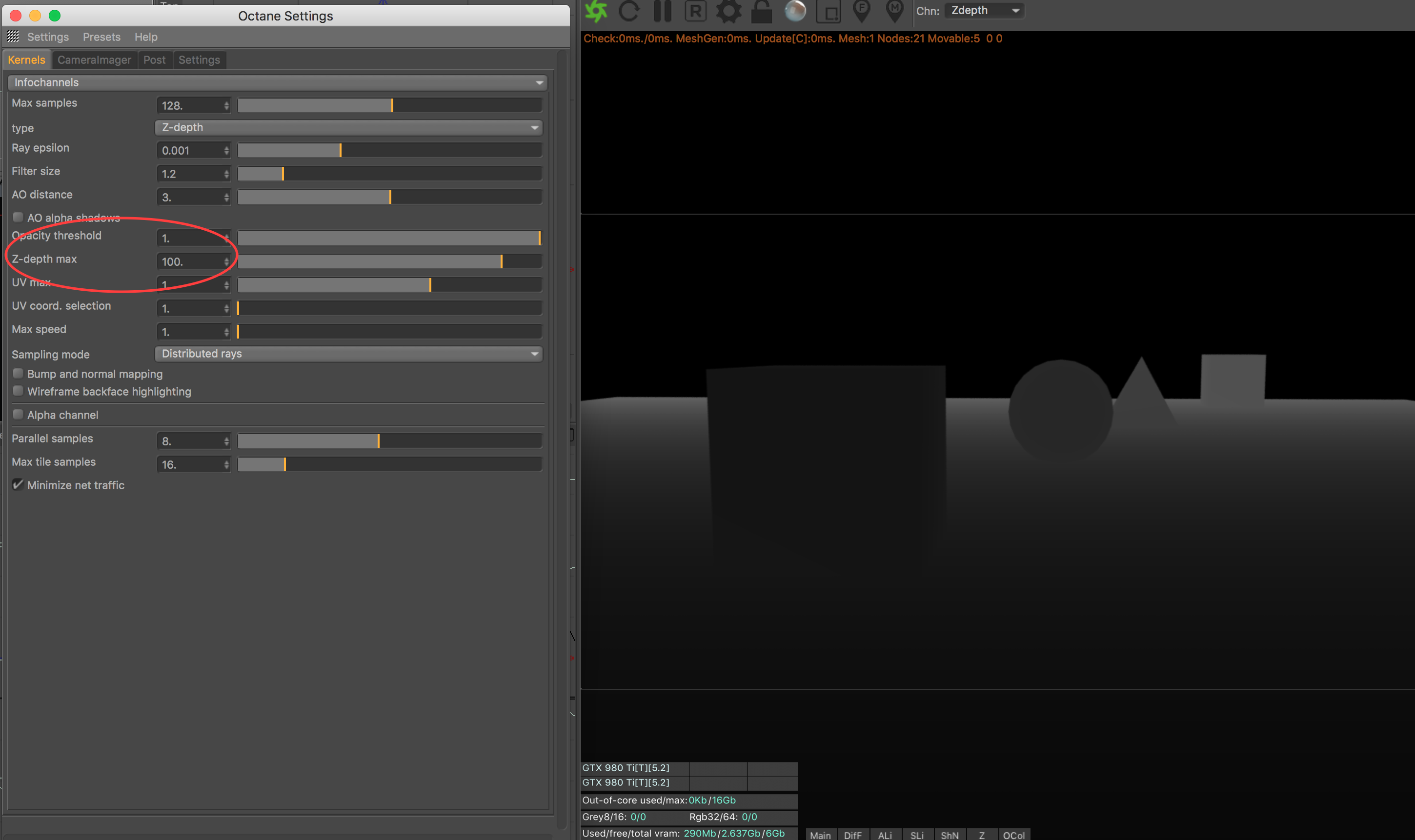The really odd thing is that the z-depth shows up looking totally fine in the octane render view.