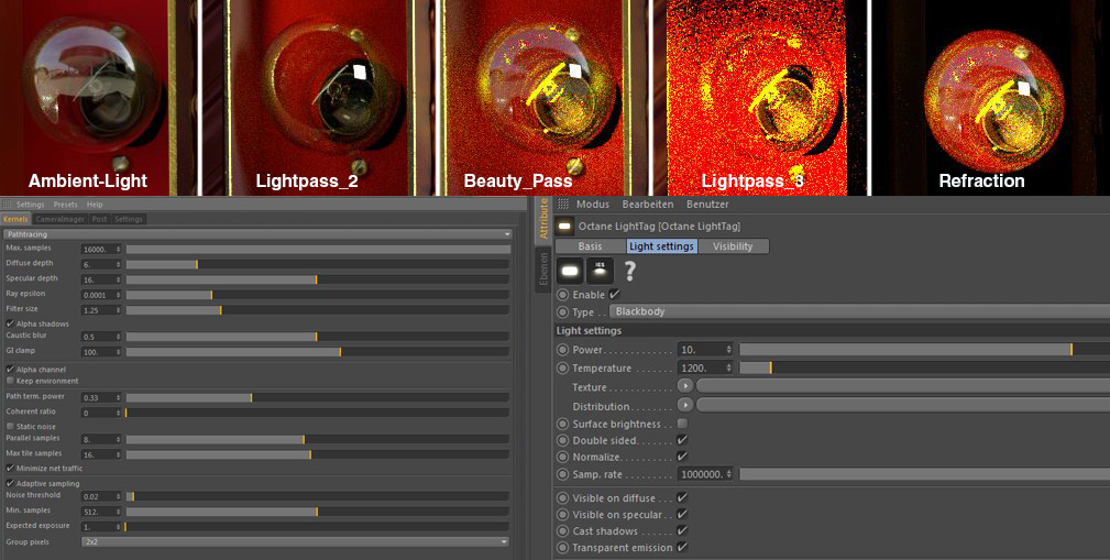 My rendersettings: 16.000 max. samples/16 spec depth/ 0.5 caustic blur/1.25 filter size 1/ Mio lightsamples