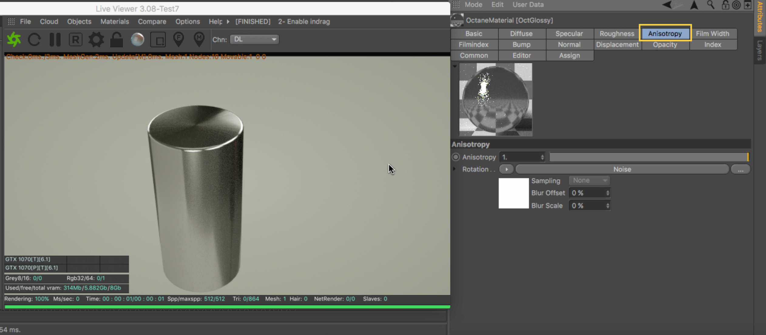 about anisotropy, plese try with 3.08test6, with proper Anisotropy support: You can change the BRDF model, roughness, and rotation map, to have different effects.