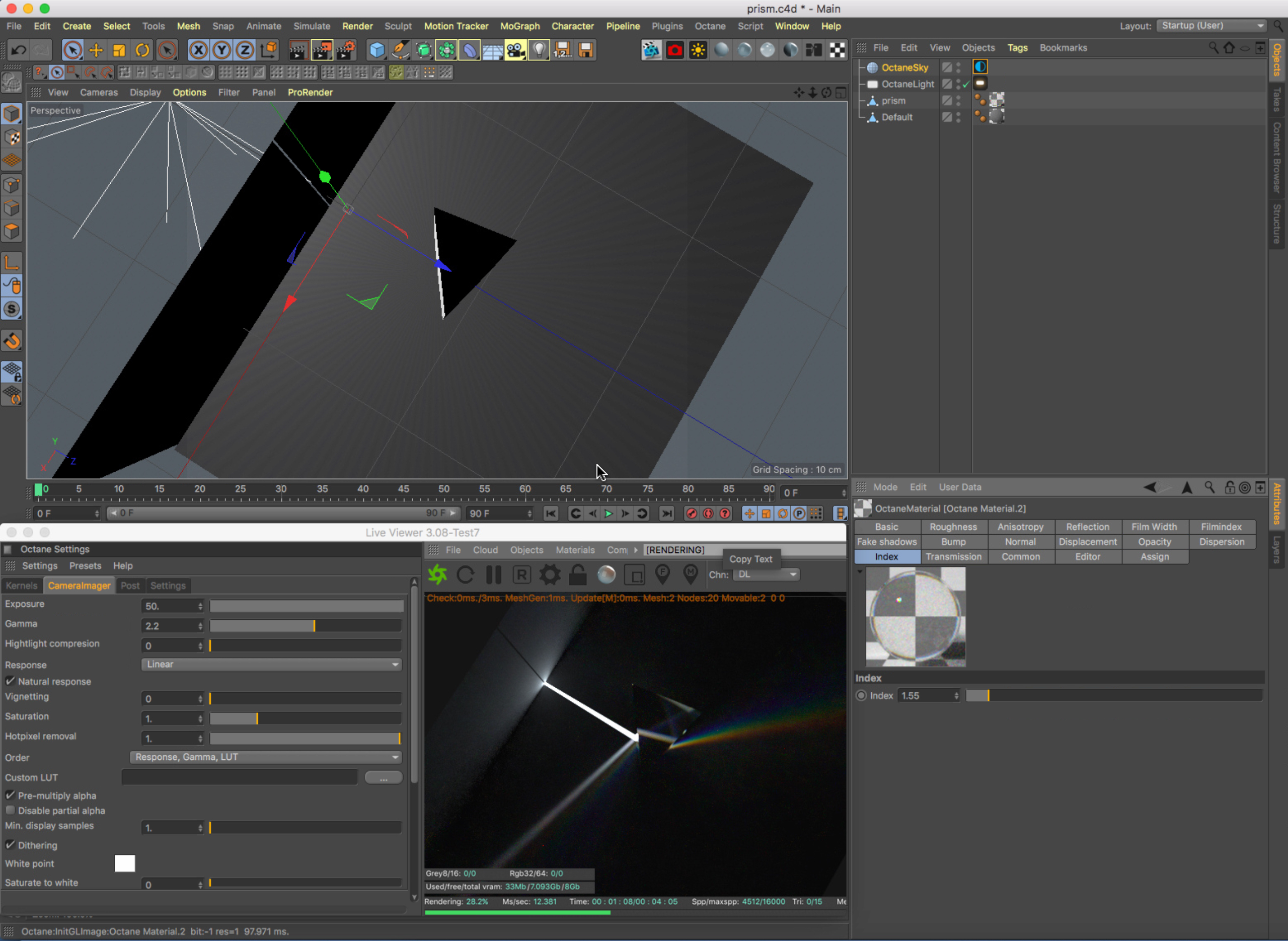 Hi guys, having issues trying to get the traditional chromatic spread from a prism. I've read in some places that this isn't possible due to the nature of the octane but Fooze managed it here: viewtopic.php?f=25&t=40134 and some other users in the standalone. Is this possible to recreate in C4D? I've tried cranking my PMC to crazy numbers to no avail (I'm on twin 1080's). Tried using a low IOR, a high IOR, dispersion etc etc but I feel like I'm prodding in the dark with hopes of a happy accident.