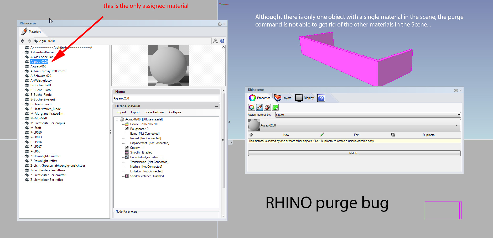 face_off wrote:This looks like a Rhino5 bug to me. May I suggest checking it on Rhino6 (there will be a plugin build for Rhino6 with the next Octane release). My initial guess as to why you need to reload the file before purging is that deleted geometry items may be still in a cache (for Undo purposes), so therefore the materials for these geometry items will not be purged.If look at the picture you will see that despite the fact that there is only one object in the scene the material editor is full of old "ghost" materials belonging to objects I deleted. I executed the purge command several times but the materials remain in the scene.