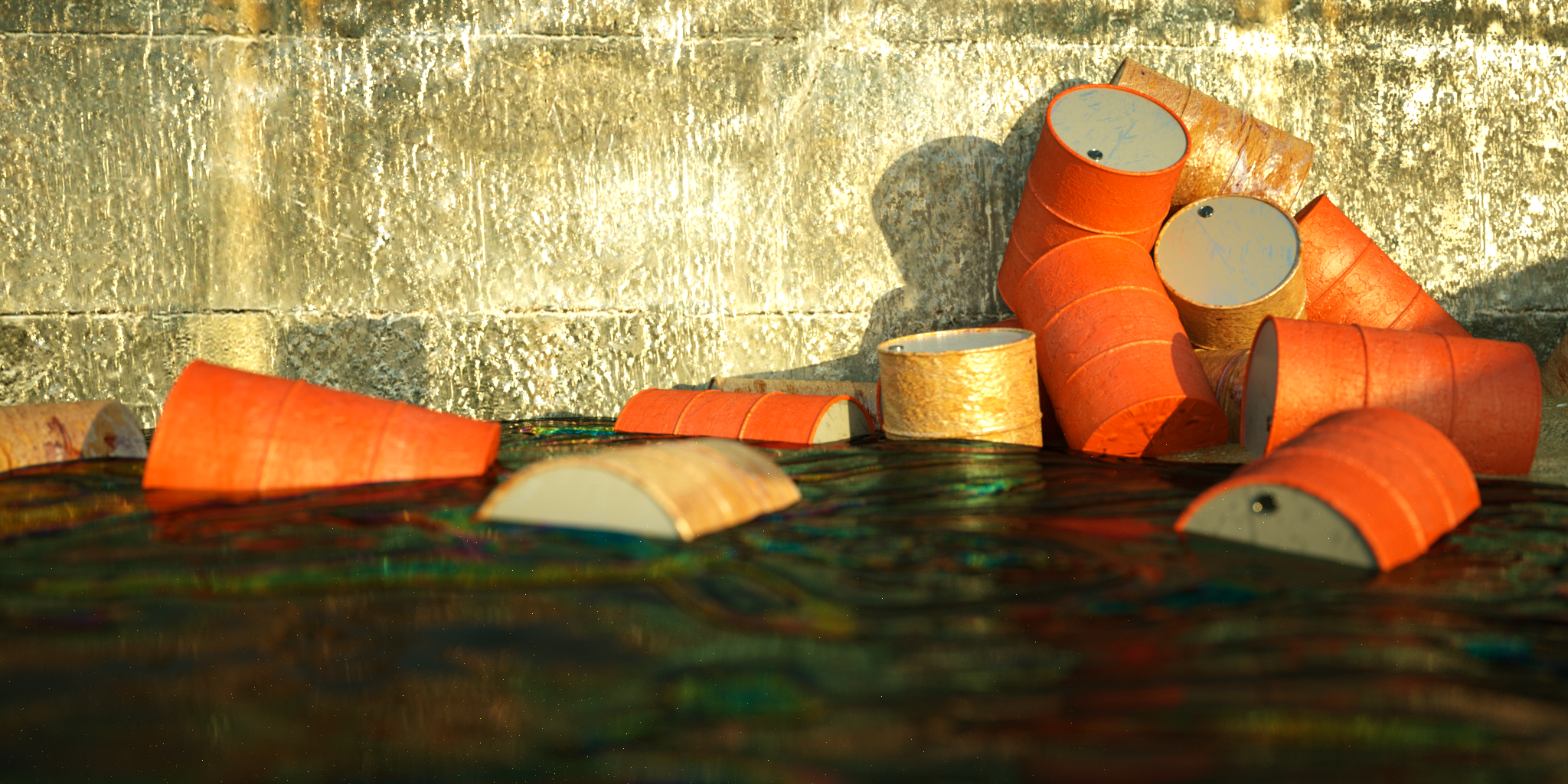 Nice work on the oil so far. If you're going for a completed piece of work, I'm recommend adding oil stains on the barrels both on the outside where they're been in the water and where it poured out of the holes.