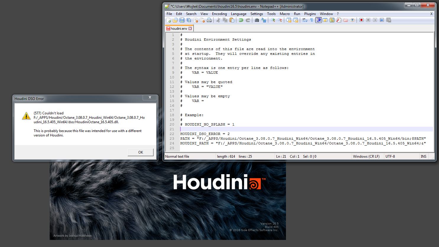 I'm having the install issue with Houdini. I haven't used Octane for a while now, just installed H 16.5.405 and edited houdini.env file and pointed to 3.08 version for 405 but still I get an error on start. All icons are visible inside of Houdini, but none of them work. (attached, erro and env file screenshot)