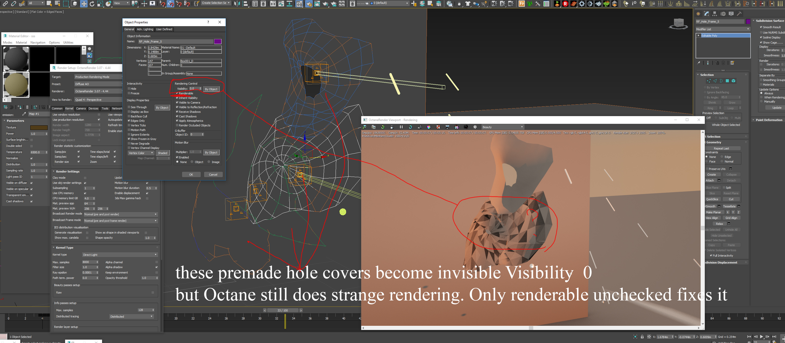 1. anyway when visibility is set to 0 octane will not render an artifact of two objects being in the same space. I know rendering unchecked fixes it but we have to use visibility because the way chunks of stone disappear during shooting. Thanks