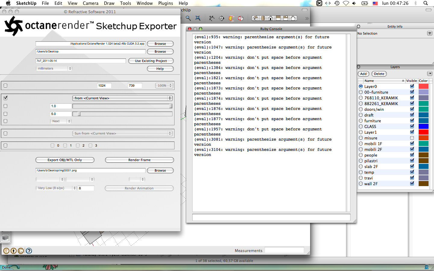 If it works OK then we know that the culprit is one of the Disabled folder's files - so now close Sketchup and move half of those Disabled rb/rbs files back into the Plugins folder and restart Sketchup and test the Octane Exporter, if it's still OK then keep adding back half of the remaining Disabled files until it fails to work, then the culprit is one of the files you just moved across - move halves of those back into the Disabled set until you have success with the exporter again, this way you can zoom in on the problem script: 512>256>128>64>32>16>8>4>2>1 in the worst case...