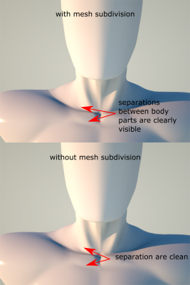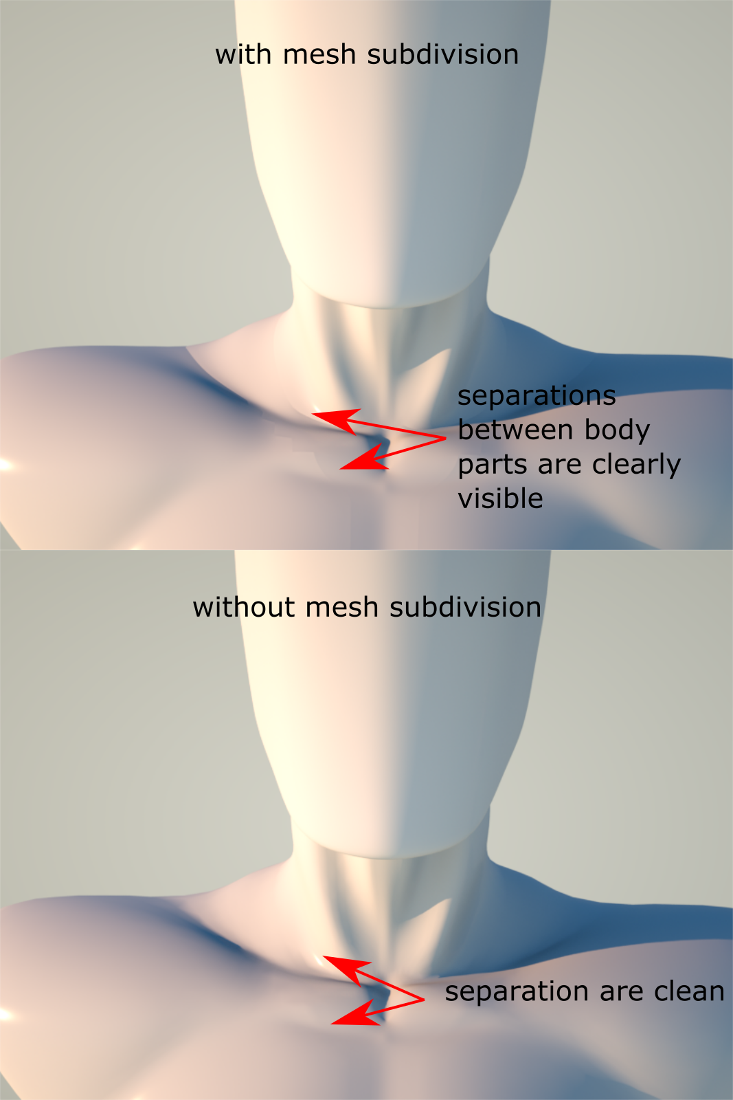 I would like to smooth a character mesh using subdivision in octane plugin. However it seems that this functionality creates visible joints between the different body parts (see attached image). The only difference between the two images is the Subd level in material property set to 1 in the first image and to 0 in the second.