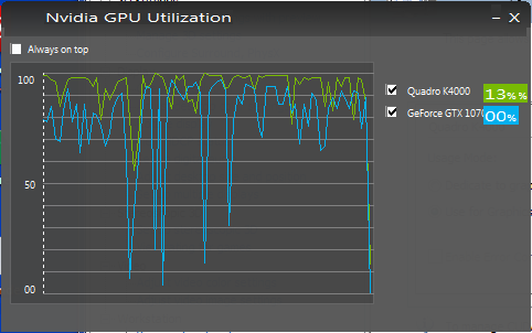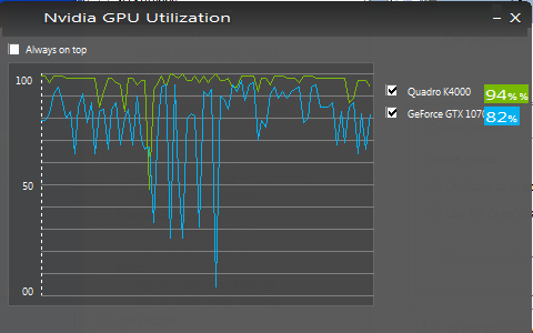 The Quadro is always at around 98% Utilization but the GTX goes from 98% for a few seconds then down to 70% very sporadically, sometimes it goes down to 00%. Is this normal? Maybe its solving a bucket of info and goes down to a lower utilization percentage while the GPU gets more info to process? See screenshots. Please note: it doesnt always go down to 0%, mostly its between 98% and 40%.