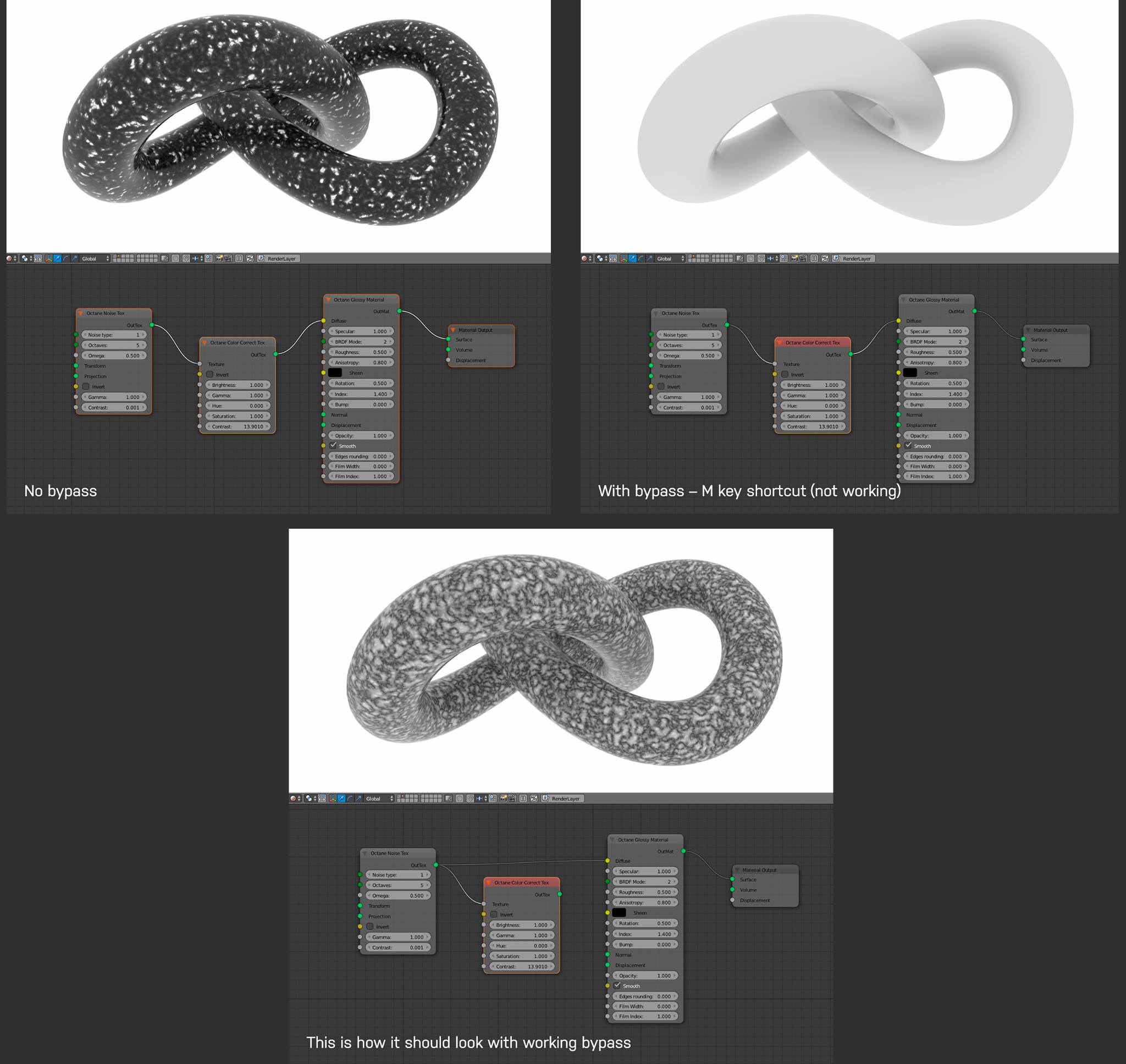 Muting a node (M key shortcut) in node editor does not work in latest and previous editions. Cycles works fine with this method.