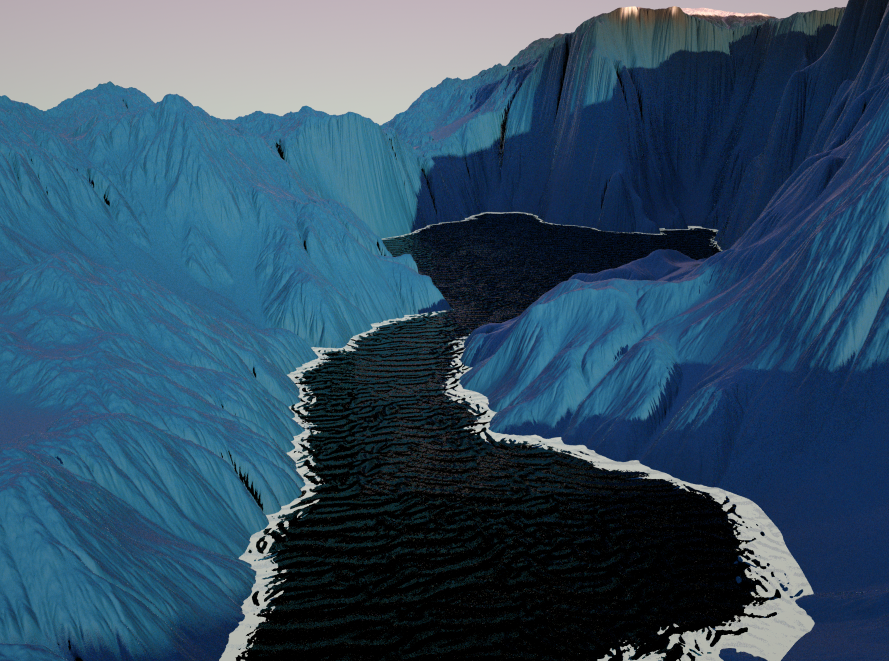 It is hard to tell without the scene - however it could be that the displaced mountain geometry is intersecting the water geometry. If this is the case, lower the Kernel->Ray Epsilon.