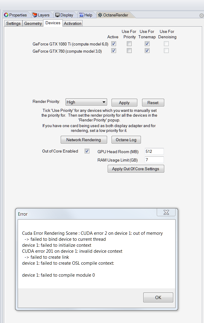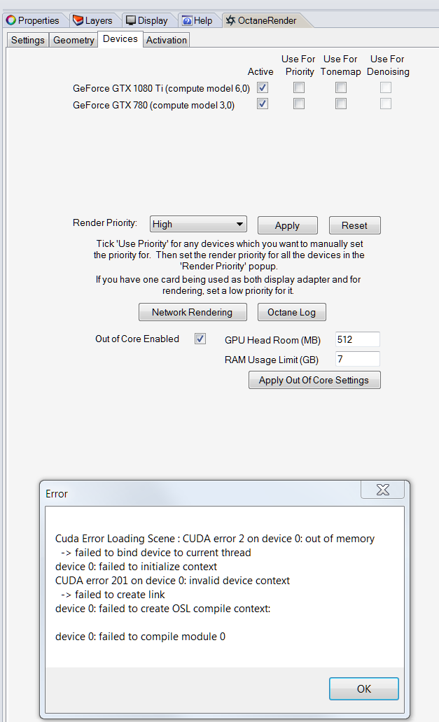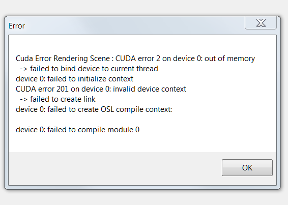 Attached some screenshots from my tests. Memory and VRAM shouldn't be a problem, there is more than enough. Also simple scenes like a cube only can't be rendered.