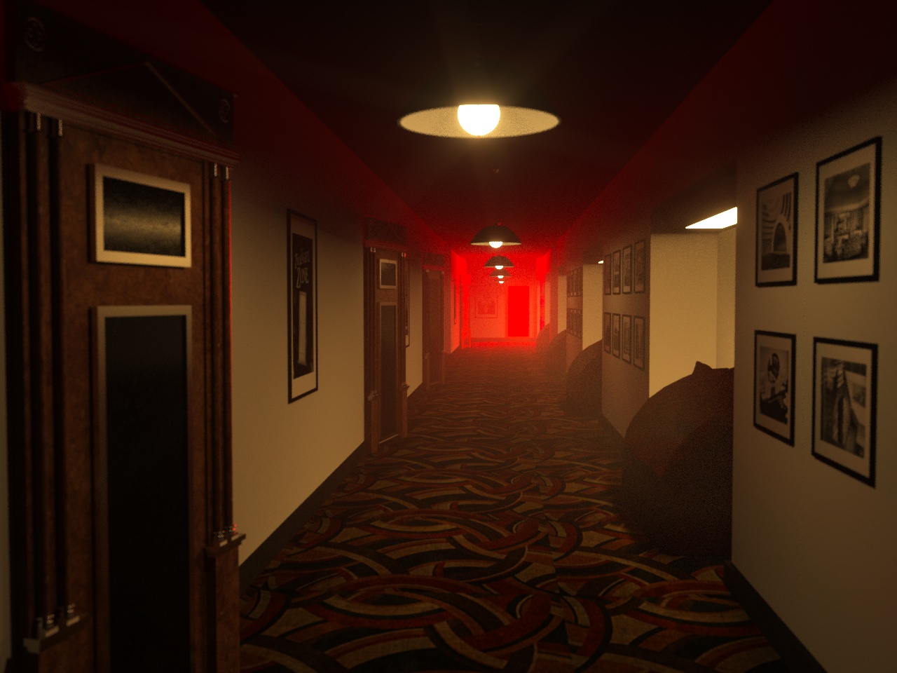 The pictures on the right wall have no glass and do not reflect anything. This would add atmospheric to composition. You can also reduce the value of the glare, but slightly increase the bloom to add a glow of air around the bulbs.