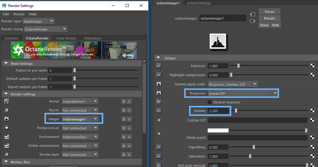 Then attach an Octane Imager node from the render settings and try these settings