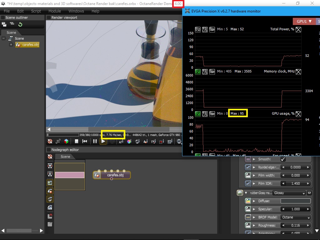 I tested "Carefes" scene at PMC kernel with "parallel samples" 1 on CPU [email protected] and on EVGA GTX 980 Ti SC+@stock with v416.16 driver running Windows 10 x64 build 17763.134