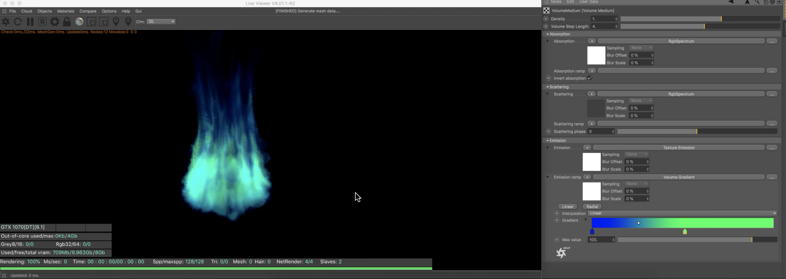 Desired fluid simulation can be created by using Turbulence FD or X-Particules, but when I render them using OctaneObjectTag, I feel that realistic flames and smoke constituents will inevitably increase.Indeed, energy and aura are necessary to fly voxel concentration gradient appropriately to the extreme shape rather than assigning color or light emission to a simple gradient according to the simulated voxel concentration (just as Graph Editer of Turbulence FD's rendering setting )However, OctaneObjectTag does not have such voxel rendering setting items.
