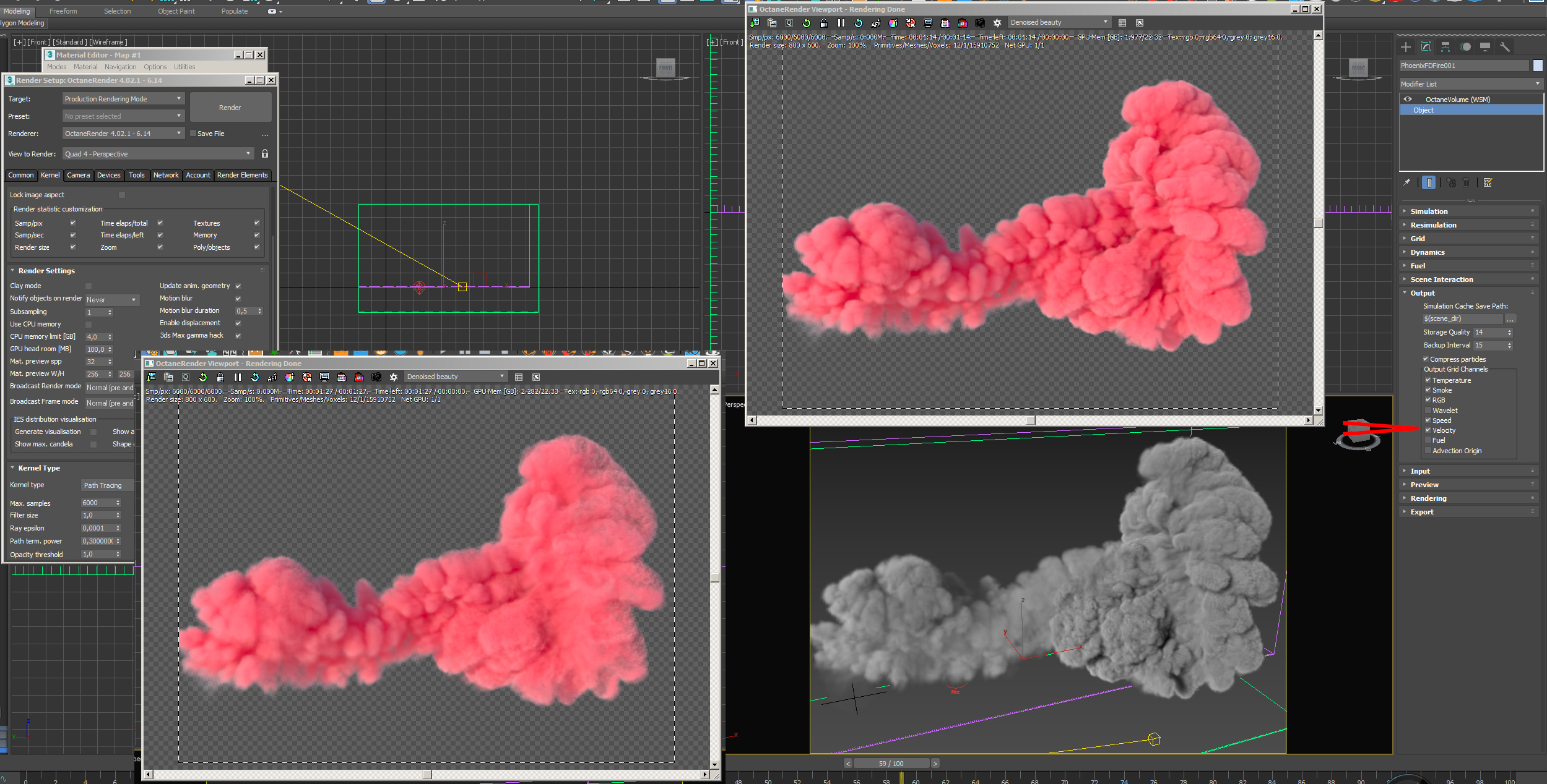 - Implemented the PhoenixFD simulator support. You need to apply the new "OctaneVolume" modifier on top of simulator object to have access to additional Octane-specific settings. Mapping of PhoenixFD channels to Octane: temperature -> emission, smoke -> apsorption -> scatter, and velocity -> velocity.