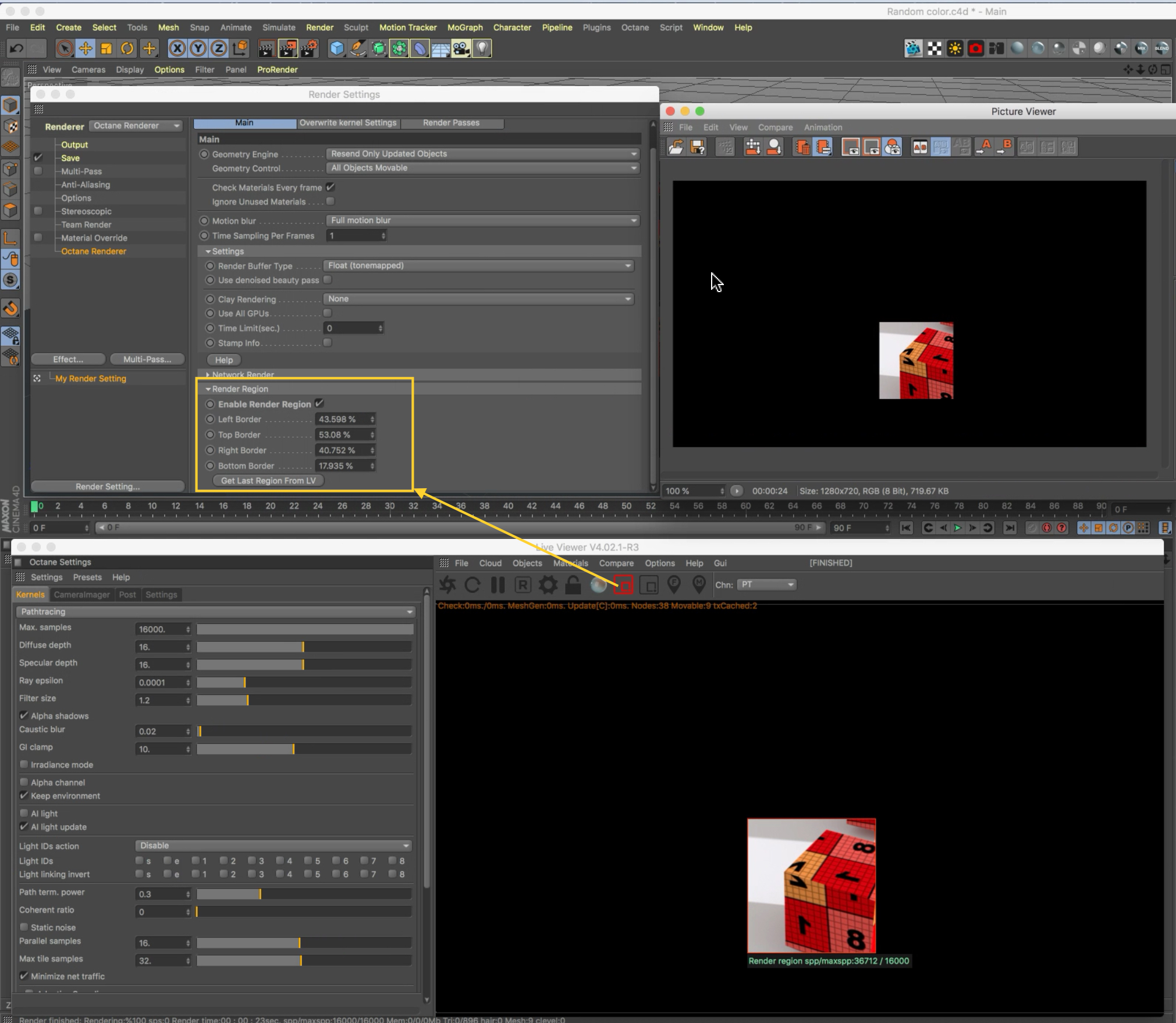 I calculate a preview in Live viewer then I click on the icon render region, I go in Octane setting = Main = render region I select Enable render region = get last regon from LV. Unfortunately he calculates the entire scene ...