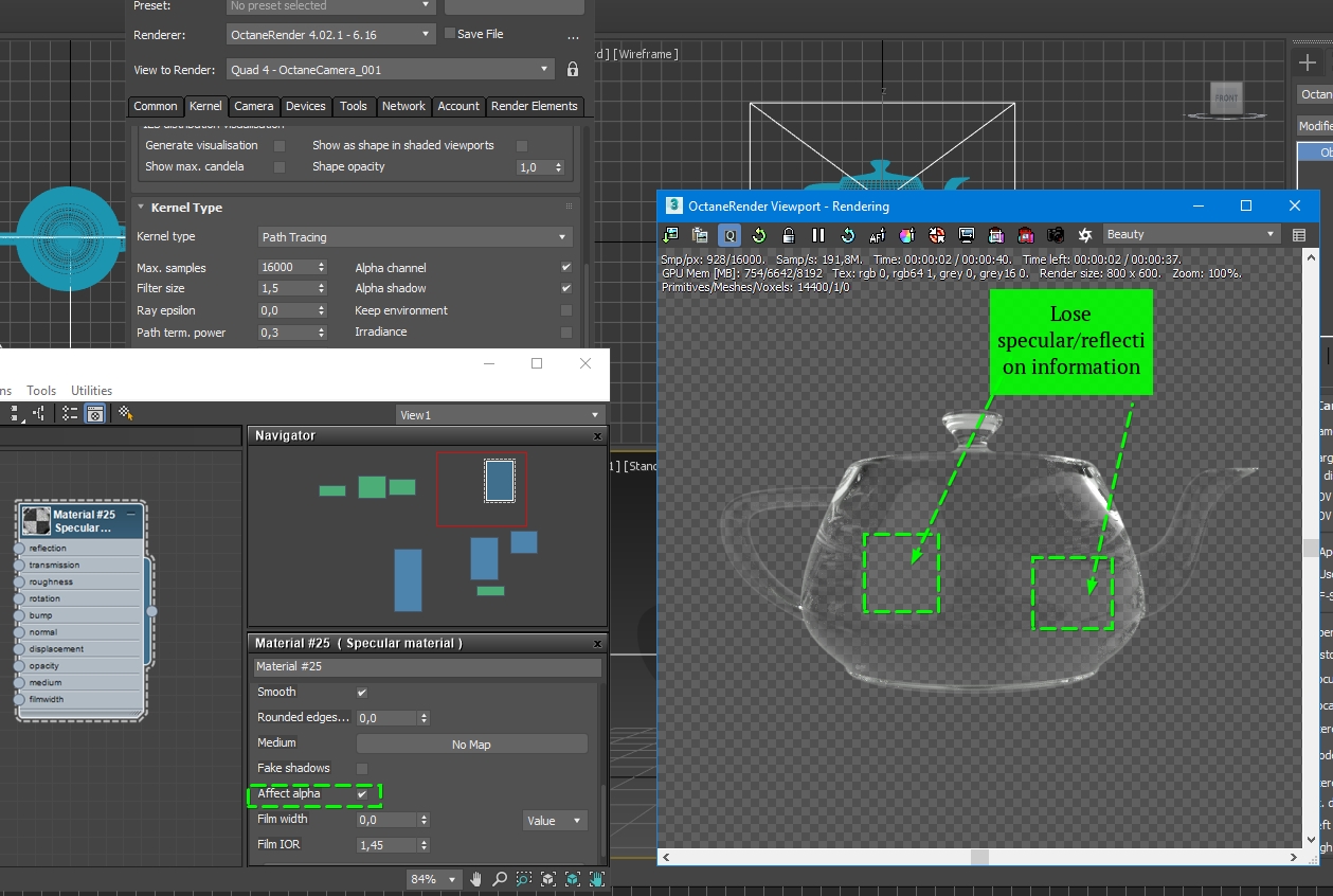 Paride, forget about passes. I think the problem is, that with Affect Alpha ON we lose some specular-reflection information. Check my images.