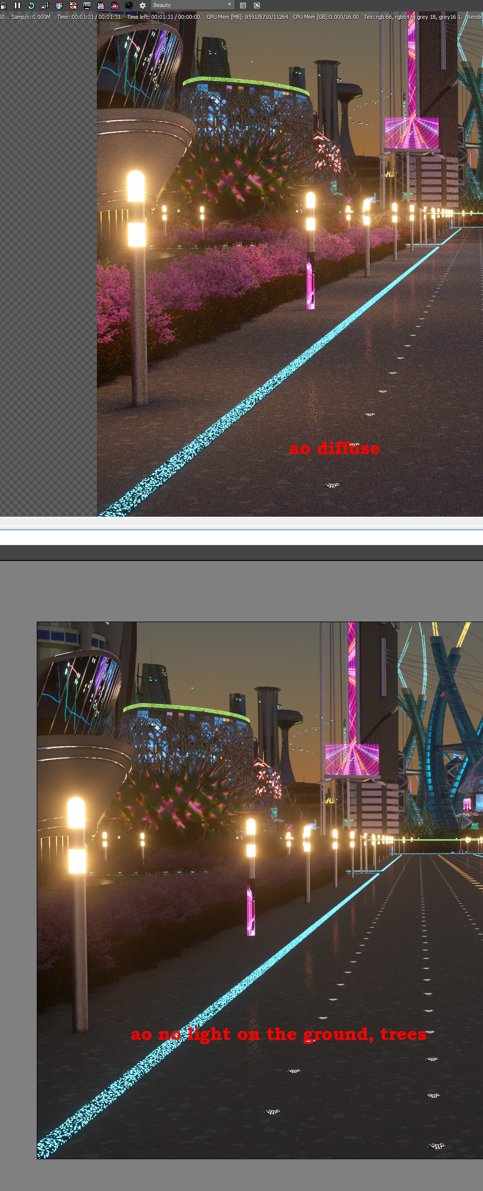 The one thing I dont get is why there is no direct light under the lights in AO. It's not like it is a bounced light. this is direct light from the light. And it works in difuse mode/pathtracing but not in AO mode. Anyway otoy can improve this in the future?
