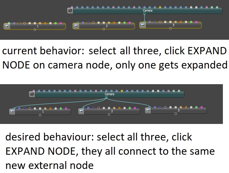 This is more of a general Octane problem, but I have not found a fast way to create a node for multiple elements easily without plugin them all manually. when I select multiple nodes and selct one of their internal nodes and click EXPAND, it would be great if all those nodes could connect to a new node instead of just one of them connecting to a new external node.