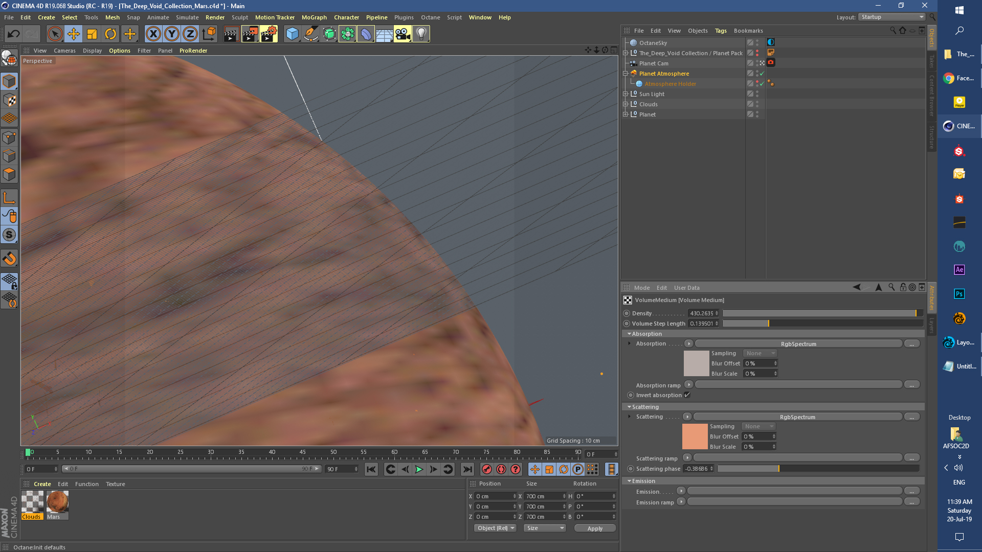 I'll try to take a look at your scene. I suppose that you need to use a volumetric sphere to build the atmosphere if you want to use this workflow, but first, please check your scene scale ... to me it is too big, and this can be a problem for Octane and the volumetrics. While your grid size is 10 km, in the C4D screenshot the grid size is 10 cm.